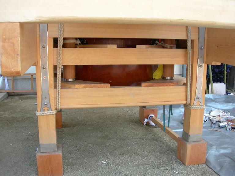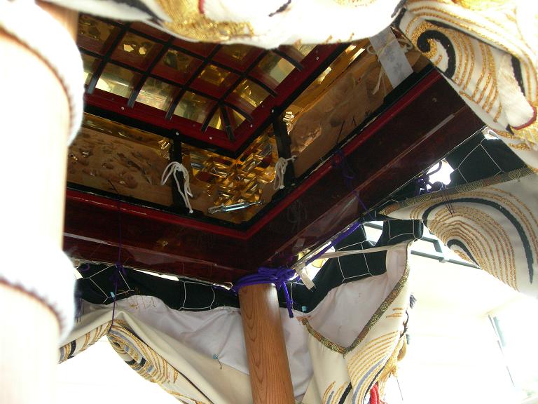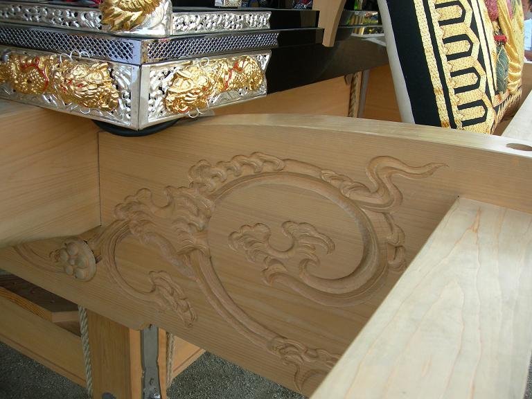 上の写真は中ノ丁の屋台ですが、クリックしていただければ、細部の装飾がお分かりいただけるかと思います。せっかくなので、他の部分のアップも掲載してみたいと思います。 上図は脚部の写真です。この写真では境内に据えるための台座の上に設置されています。天満宮までの道中は、脚部の下に車輪を装着して移動します。 次は太鼓です。屋台本体には、このような大きな太鼓が備え付けられており、4名が乗り込んでこれを叩きます。先ほどの脚部の写真の奥に見える茶色い部分は、この太鼓の下部にあたります。 これは天井部です。外からは決してみることができない部分ですが、このようになっています。 続いては、脇棒との接続部です。こんなところにも彫刻が施されているのが分かります。 これは側面の布団です。非常に豪華な装飾がお分かりいただけるかと思います。 最後は透かし彫りです。最初の写真にも同じ透かし彫りが移っていますので、位置関係を確認してください。 というわけで、地元の人間にとっては何でもない写真なのですが、外部ののこういうのが好きな方にとっては、それなりに貴重な画像ではないかと勝手に想像しています。 次回は、性懲りもなく、もっとマニアックな画像をご紹介します。 PR |